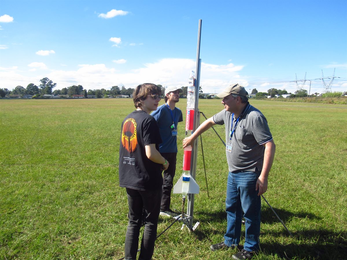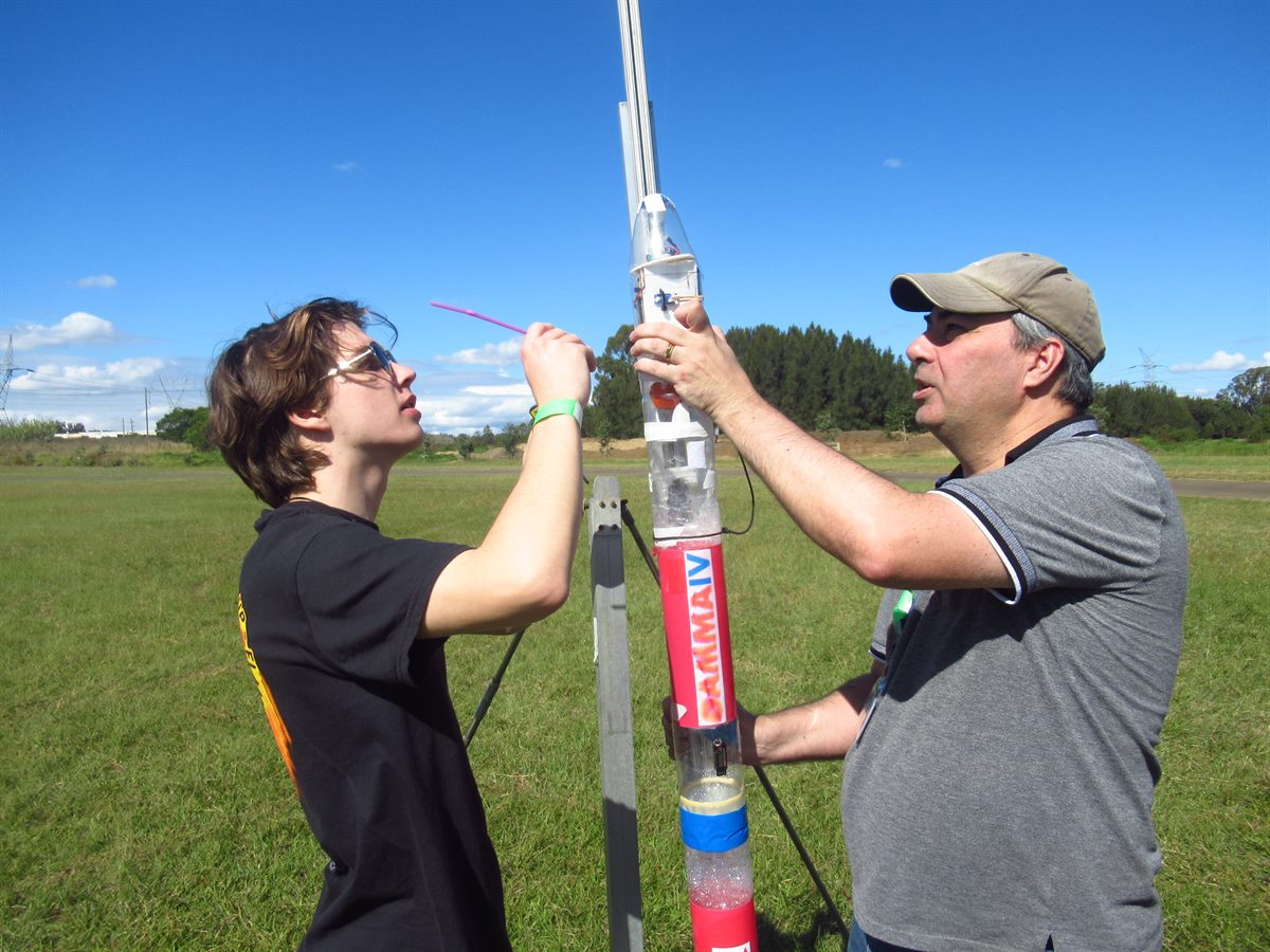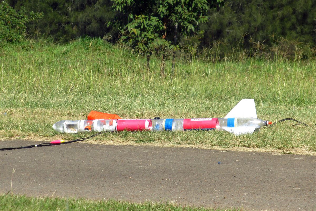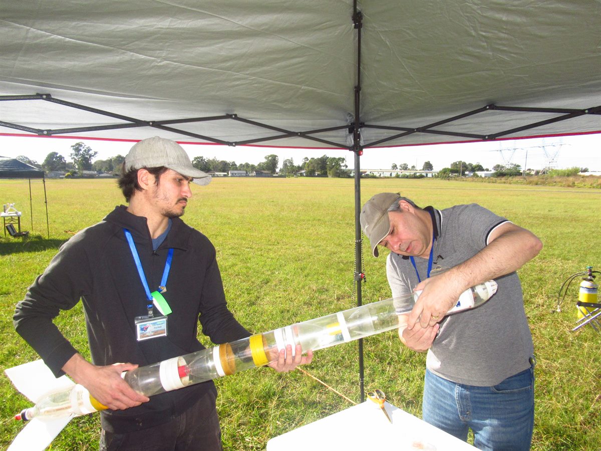 After a few months of trying to co-ordinate a launch, this week we had Tavvi from ARRO rockets come visit at Whalan Reserve. He brought one of his water rockets to fly. Luckily most of the design is similar to ours so he was able to fit to our guide rail and launcher.