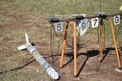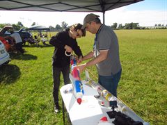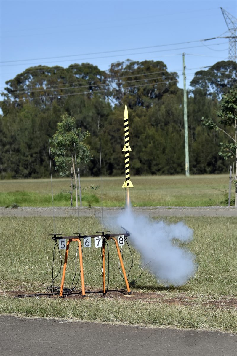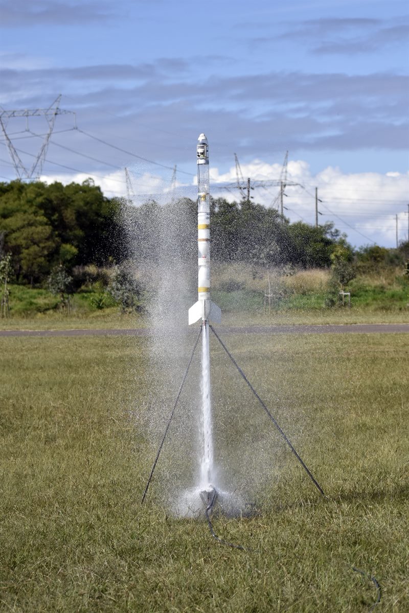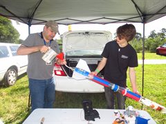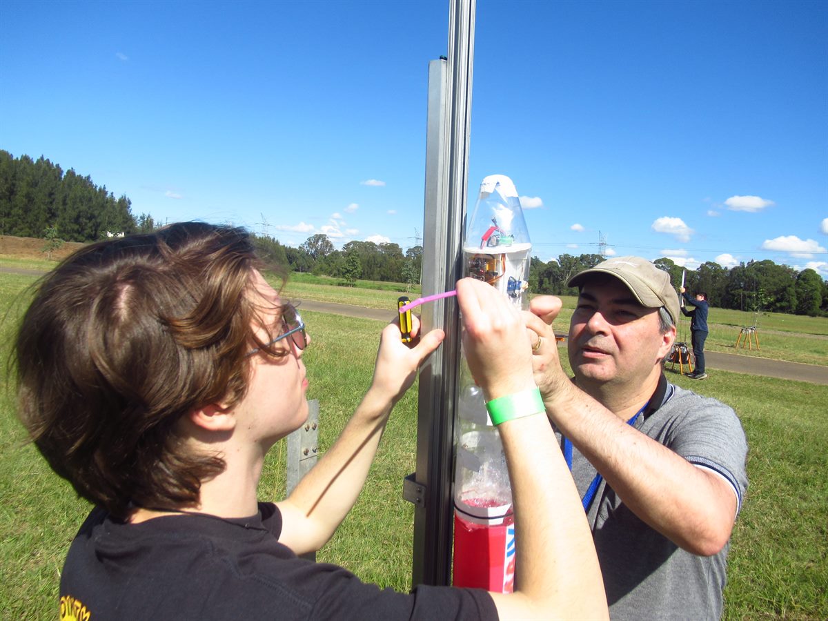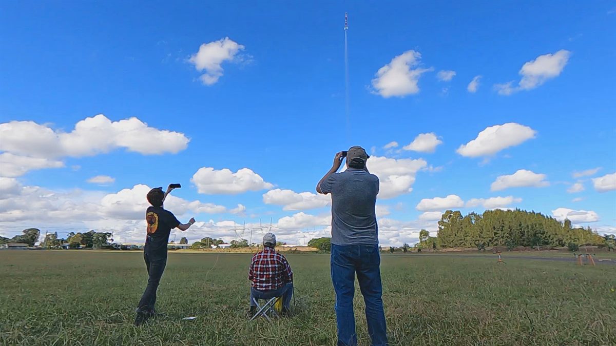After a few months of trying to co-ordinate a launch, this week we had Tavvi from ARRO rockets come visit at Whalan Reserve. He brought one of his water rockets to fly. Luckily most of the design is similar to ours so he was able to fit to our guide rail and launcher.