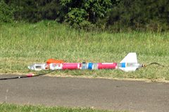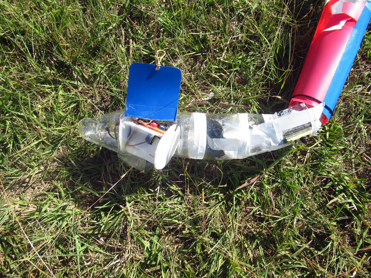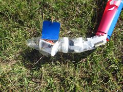 For the second flight the flight computer wasn't working properly, likely damaged during the crash, and so we replaced the entire nosecone with one of our spare ones. We also replaced the nozzle with one of ours. The rocket was filled with 1500mL of water and some shampoo.