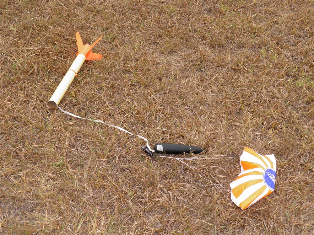 So we were up to the challenge this year with a couple of pyro rockets. Paul launched his venerable Pod 2, however, the altimeter in the parachute bay likely wedged the parachute and as a result the rocket crashed heavily and broke a couple of fins. The rocket will be repaired and will fly again. We took off the now singed parachute and placed it inside of John's Dust Devil rocket. It was a very tight squeeze but the rocket flew nicely to 537 feet on a C6-3 with a hang time of 55 seconds. With a few mods it certainly had potential.
