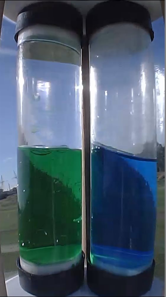 Looking at the video of the two tubes, in the tube on the right you can clearly see the water move up shortly after burnout as would be expected because of the drag on the rocket. As the rocket continues to apogee and beyond the water remains in the top portion of the tube until the parachute opens.