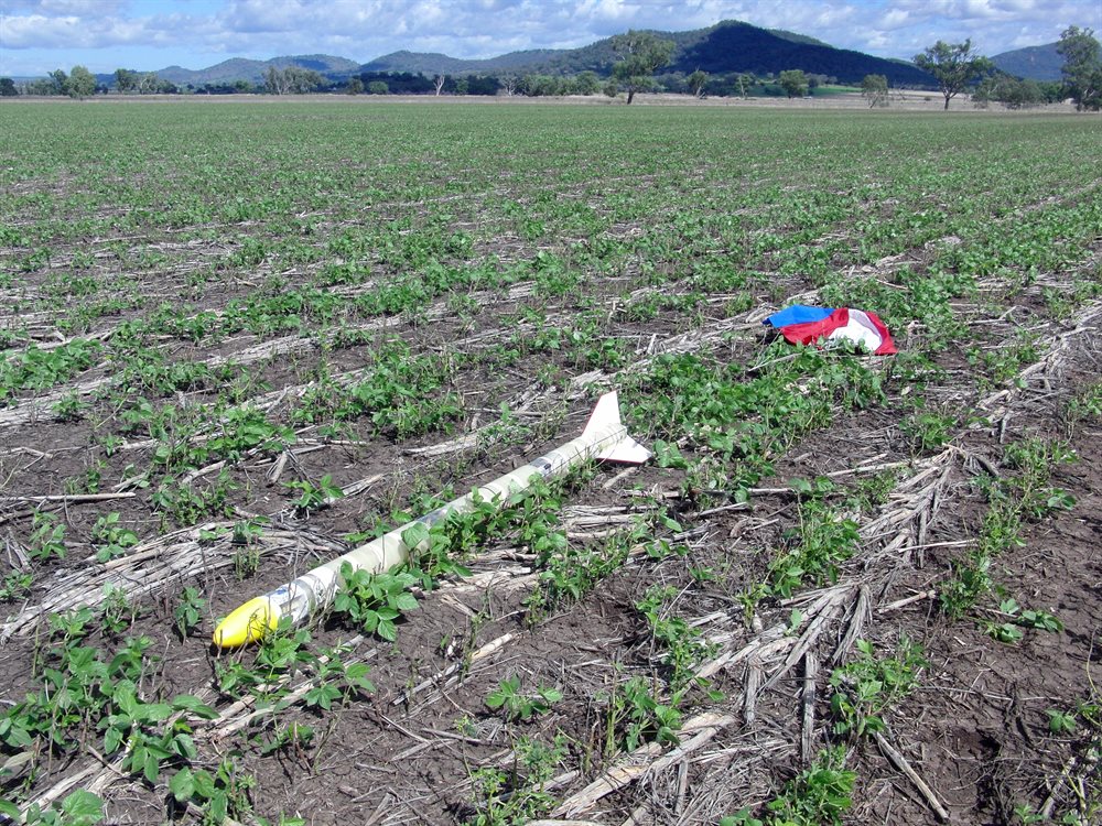The rocket was pressurised to 220psi and launched. It only reached 670 feet which was a little disappointing as we had expected around 800 but still it was a good flight. The parachute opened when it was supposed to and the rocket drifted quite a ways but landed fairly gently. Unfortunately the nose must have hit the ground at a bit of an angle and broke the bottle neck at the top tornado tube. The bottom section with the parachute still attached was dragged by the wind a little further further.