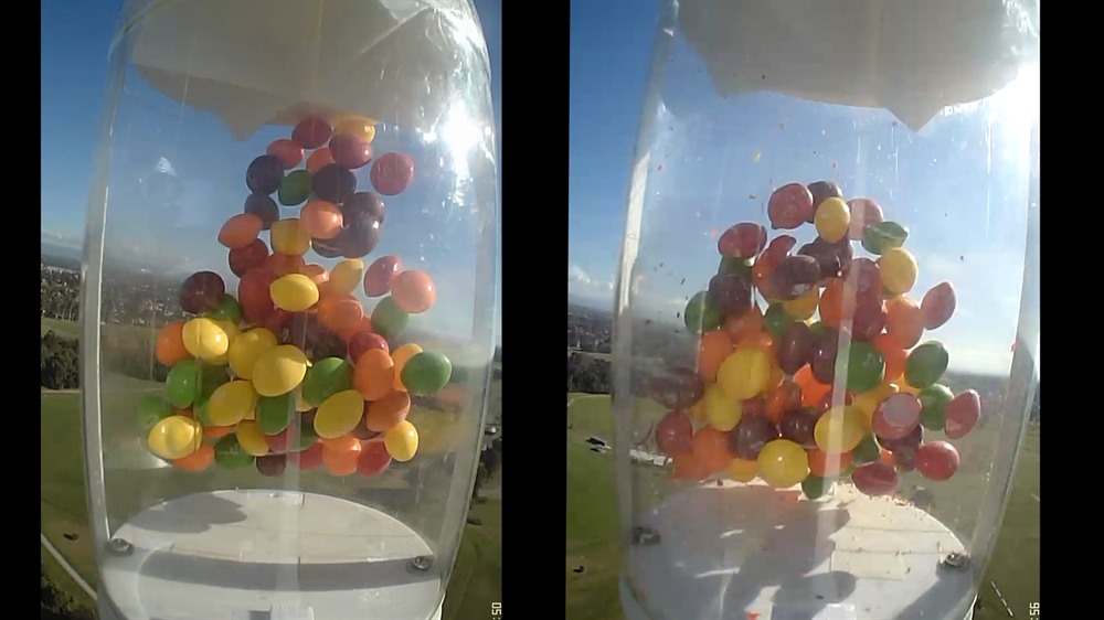 The faster rotation of the agitator looked like it worked better and you could clearly see some of the skittles floating for a brief period of time right around apogee.