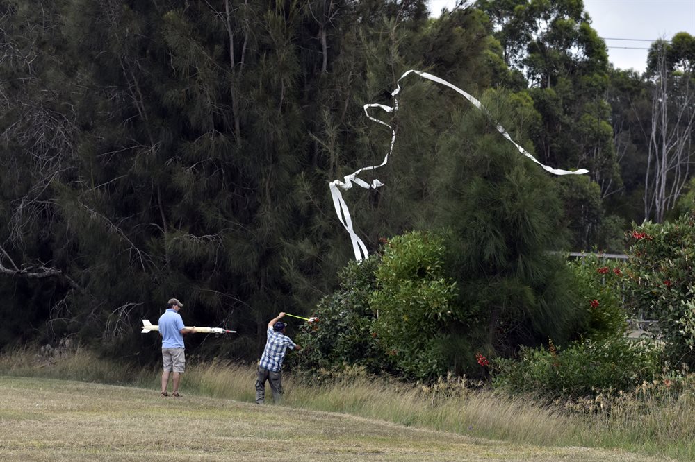 The two flights went well and released the roll just after apogee. The roll unwound fairly quickly and then proceeded to drift down gently. From the on-board video you could see that as the rubber band over the roll was released while there was some airflow over the rocket the roll started spinning while still on the rocket before sliding off. The paper must have caused enough drag to cause it to start unwinding.