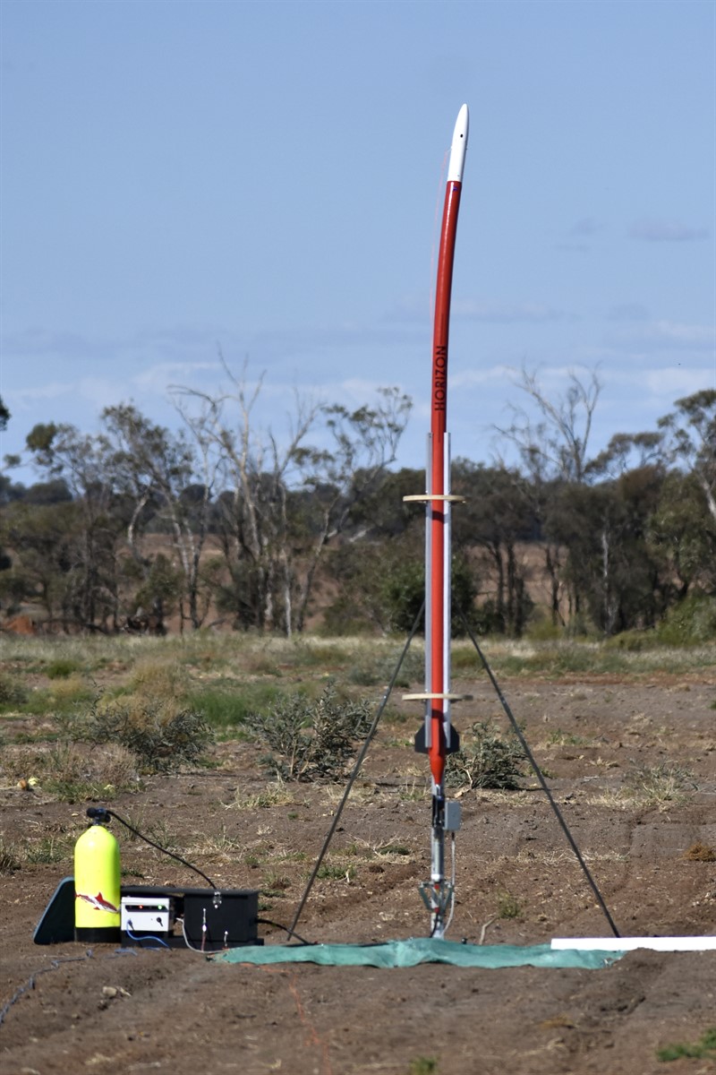 We set the Horizon rocket up on the pad and started pressurising it, at around 500psi we noticed that the rocket had a slight bend in it above the tower. As we continued to pressurise the rocket, the bend developed even more until we reached almost 1000psi. At this point we decided to abort the launch and remotely depressurised the rocket. It wasn't until we saw the rocket from the side how much it had bent, from where we were standing the rocket had bent away from us and so it wasn't as evident, otherwise we probably would have aborted sooner.