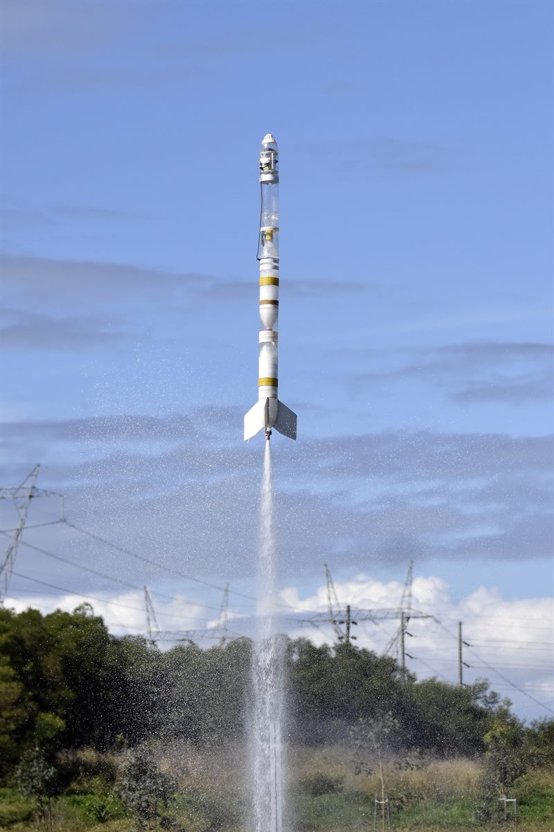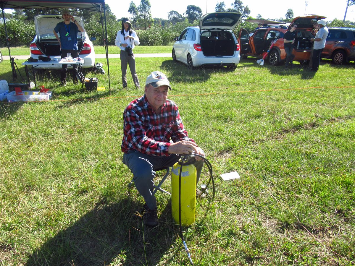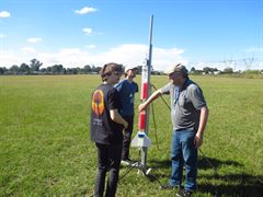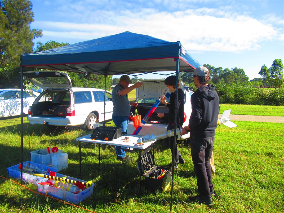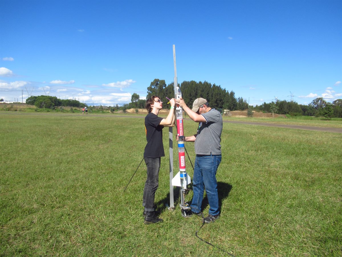 After a few months of trying to co-ordinate a launch, this week we had Tavvi from ARRO rockets come visit at Whalan Reserve. He brought one of his water rockets to fly. Luckily most of the design is similar to ours so he was able to fit to our guide rail and launcher.