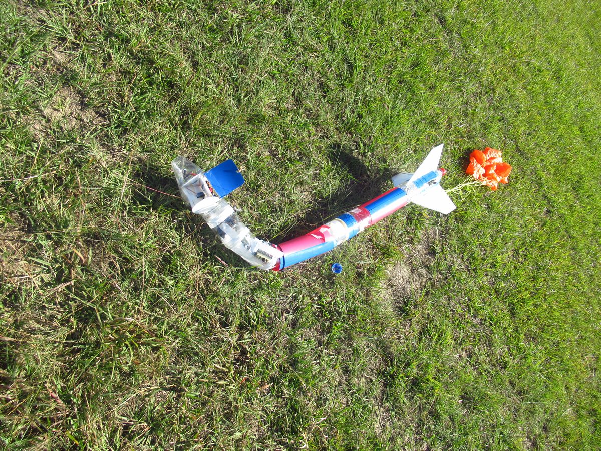 For the second flight the flight computer wasn't working properly, likely damaged during the crash, and so we replaced the entire nosecone with one of our spare ones. We also replaced the nozzle with one of ours. The rocket was filled with 1500mL of water and some shampoo.